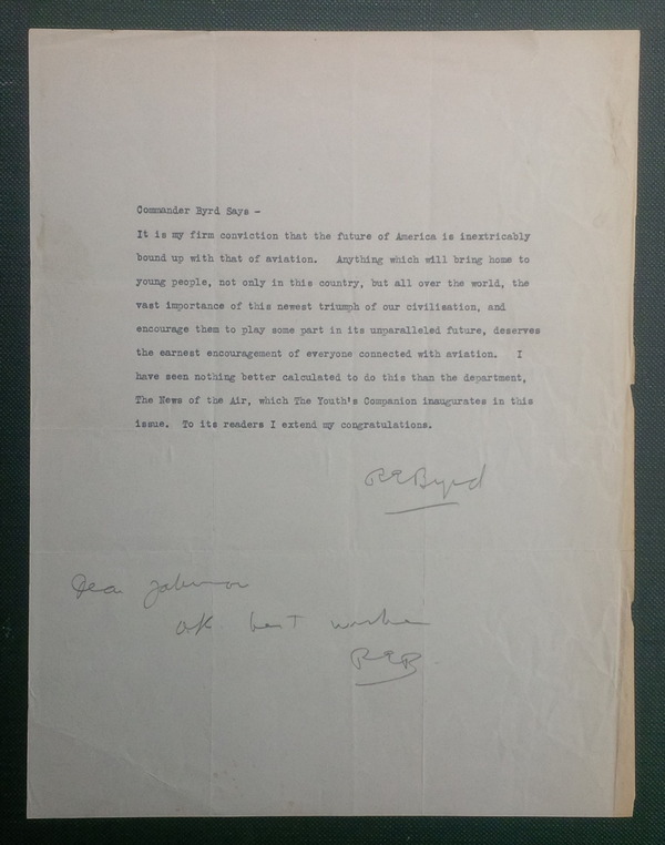 Byrd's articles reflect on his experiences and thoughts abouf the South Pole. The first two articles are entitled "At the Bottom of the World". The third article is titled "Where all Winds Blow North". The last article is titled "My Answer to the Challenge of the South" where he describes his thoughts on conquering Antarctica. The typed note reads: "Commander Byrd Says -- It is my firm conviction that the future of America is inextricably bound up with that of aviation. Anything which will bring home to young people ... deserves the earnest encouragement of everyone connected with aviation ..." This copy was owned by fellow contributor Johnson who provides two stories that appear within. The first is fiction: "The Strange Story of CREAMER and the DJINN." The second article provides warnings "If You Buy a Second-Hand Car" and notes that Johnson is employed by MIT.